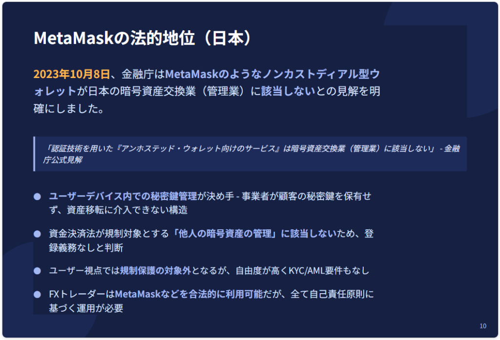 自宅の金庫を金融庁に届け出ないのと同じで、2025年10月5日時点ではメタマスクウォレットは金融庁の管轄外になっています。