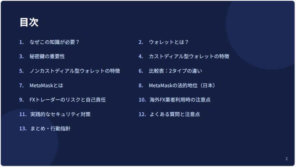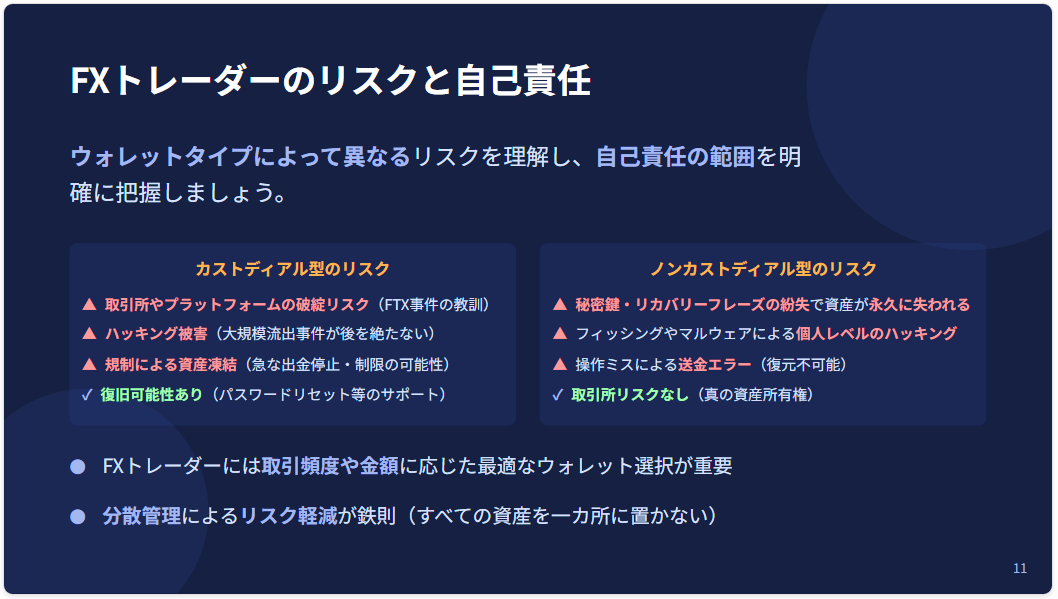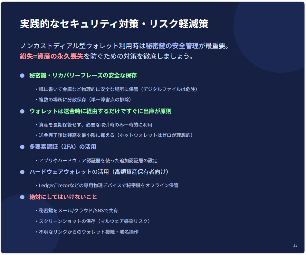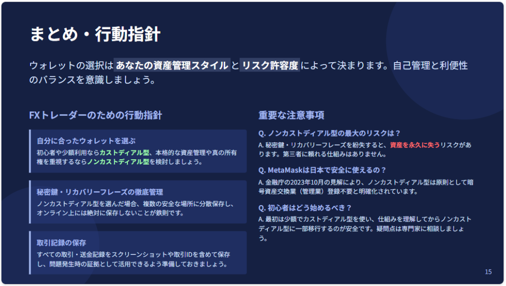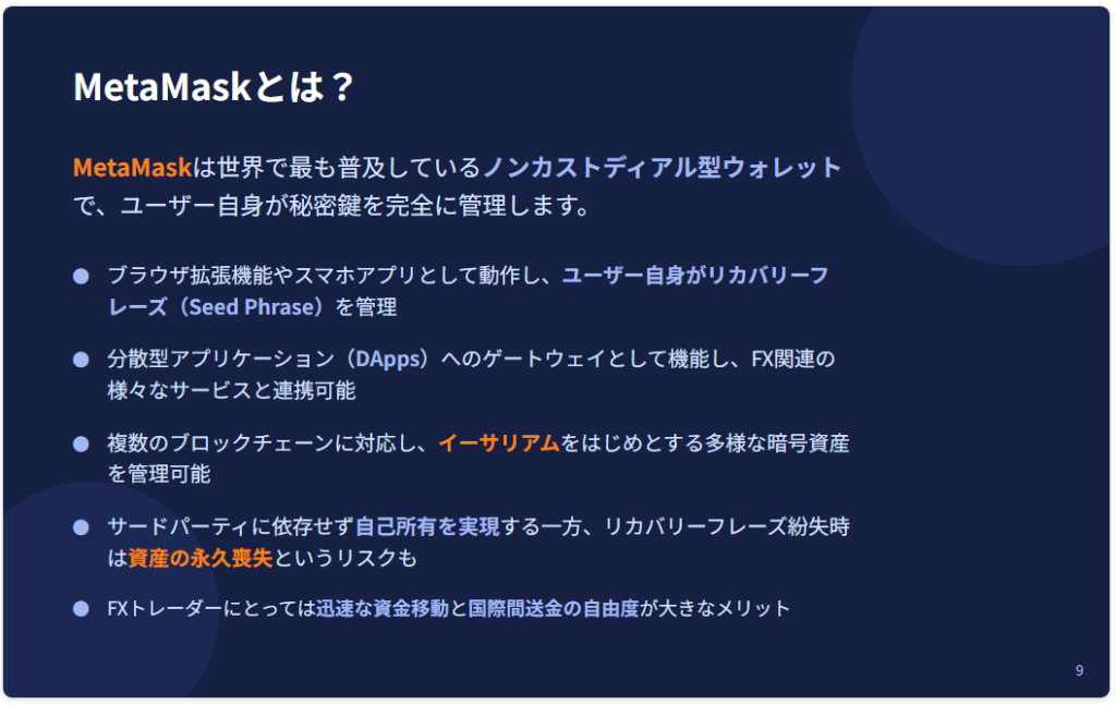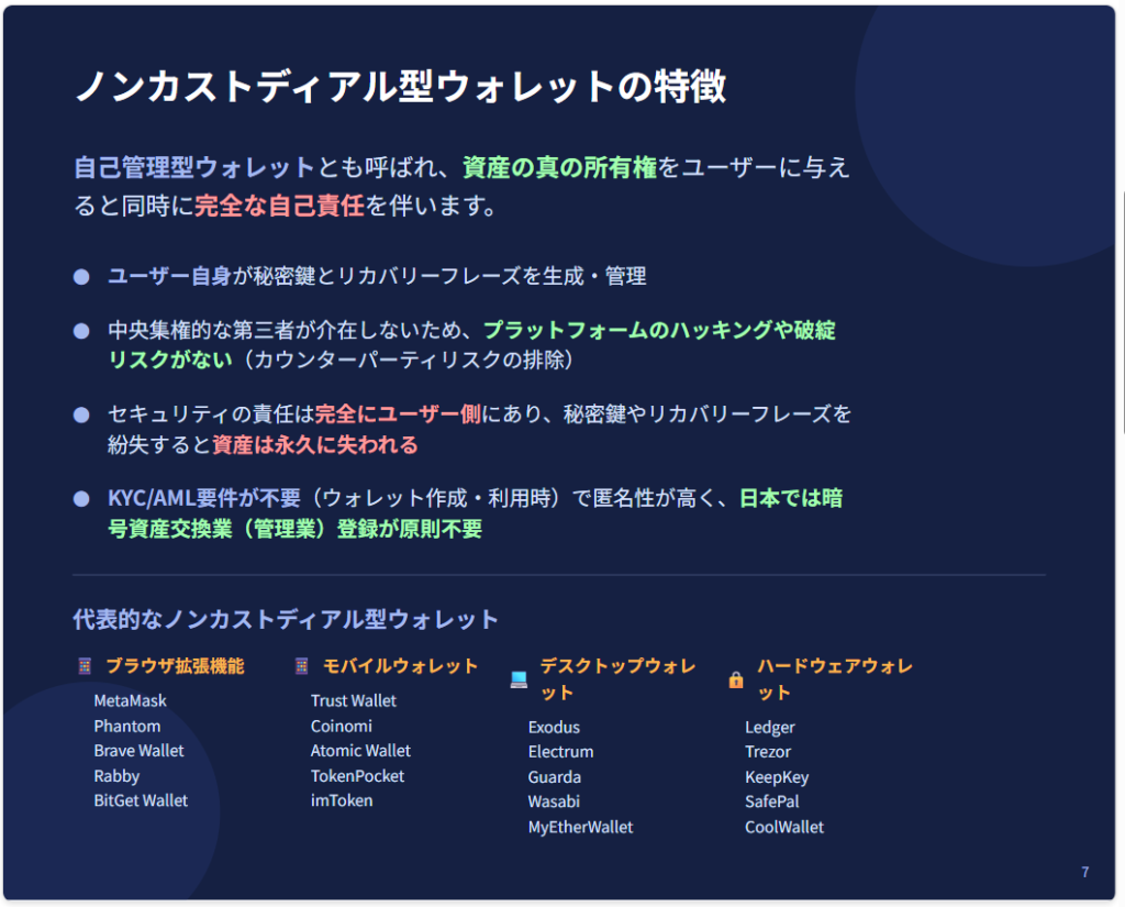 ・ノンカストディアルウォレット ユーザーが自分自身で秘密鍵を管理する。ユーザーがカストディアンになる。 メタマスクはこちらのノンカストディアルウォレット。