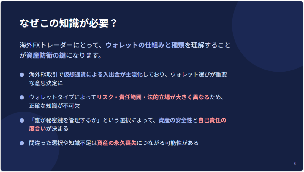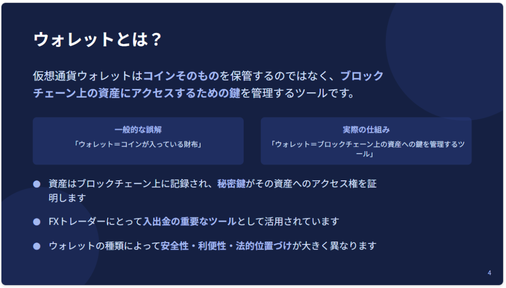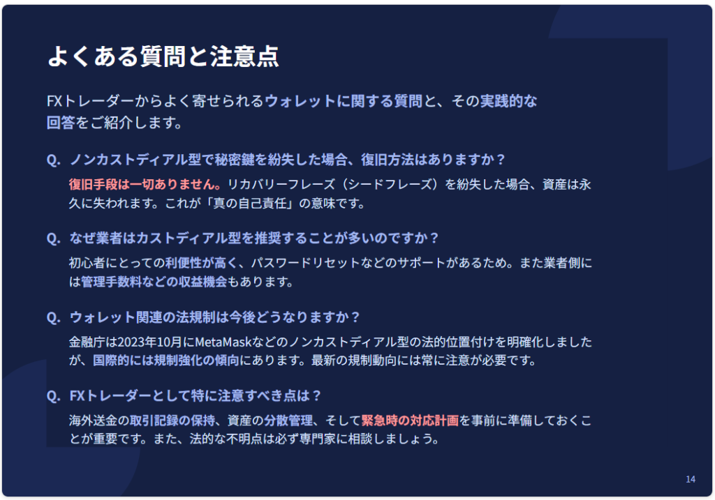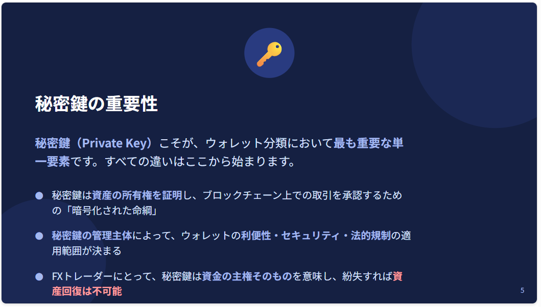 ConsenSys社がこのリストに含まれない理由は、ConsenSys社(メタマスク)が日本の資金決済法(Payment Services Act)における「暗号資産交換業」の定義から外れる「ノンカストディアルウォレット」(Non-custodial Wallet / Self-custodial Wallet)に分類されるためです。