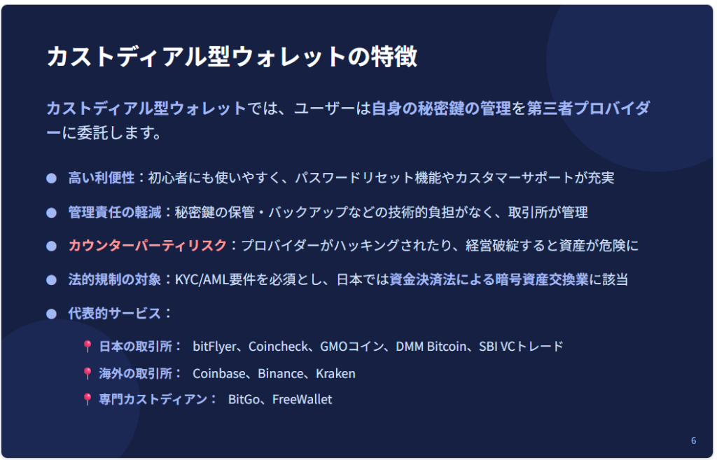 ・カストディアルウォレット ウォレットに関連する秘密鍵はカストディアンと呼ばれる第三者によって維持、管理されている。Binanceが提供するウォレットなどがこれに該当する。 ウォレット提供者の信頼が重要。