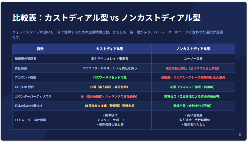 暗号資産を預けるウォレットには「カストディアル」と「ノンカストディアル」という2つの主要なカテゴリがあります。 それぞれ、下記のような特徴があります。