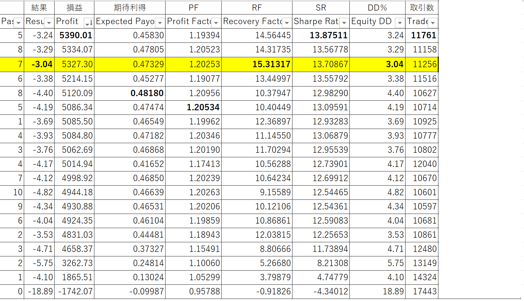 昨日、SL設定でオプティマイズをしていた結果がこれです。