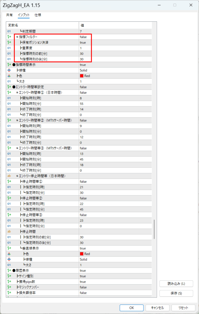 「ZigZagフィルター1」trueでシグナルは多く出る設定にして、